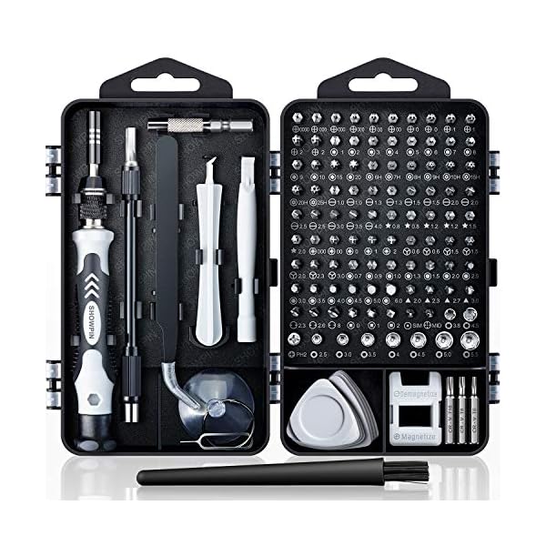 🔨【122 in 1 Multifunction Screwdriver Kit】The 122 in 1 screwdriver set includes 98 screwdriver bits, 3TorxTR screwdriver bits, 1 magnetized driver handle, 1 magnetizer/demagnetizer, 1 flexible extension shaft, 1 hexagonal sleeve socket for cordless drills, 1 anti-static tweezer, 2 plastic pry crowbars,3 ultra-thin & 6 normal triangle pry tools, 1 micro screw magnetic pad, 1 SIM card pin and 1 suction cup.