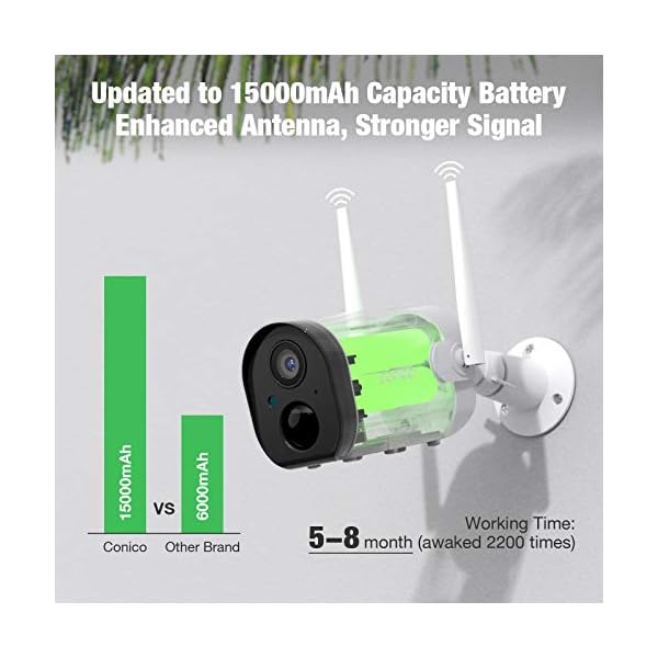 Large Capacity Battery & Enhanced Antenna: Outdoor camera has a built-in 15000mAh battery, which can be used for 5-8 months (awaked 2200 times) after being fully charged. Upgraded enhanced antenna wifi camera with advanced wireless antennas to receive stronger wifi signals. (Only supports 2.4GHz, not support 5g wifi)